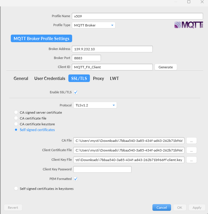 新建连接, 设置端口为 8883 , 选择 SSL/TLS ,并选择启用, 选择TLS 版本为 1.2 , 并选择 Self Sigend certificates , 依次选择根证书ca.crt , 设备证书 client.crt,以及设备私钥 client.ke , 必须选择 PEM format 点击确认。 连接即可。 如下图所示: